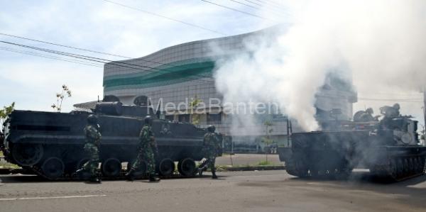 Prajurit Lapis Baja Resimen Kavaleri 2 Marinir Pasmar 2 (Menkav 2 Mar) beserta material Kendaraan Tempur (Ranpur) menghancurkan musuh dalam Latihan Pertempuran Kota Korps Marinir Tahun 2021 di Gedung Mall Pelayanan Publik (MPP), Jalan Lingkar Timur Sidoarjo, Jawa Timur, Sabtu (06/11/2021).