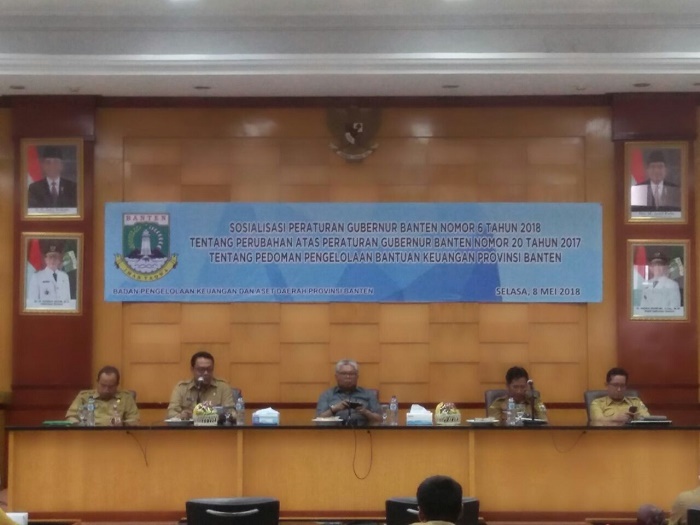 Badan Pengelolaan Keuangan dan Aset Daerah (BPKAD) Provinsi Banten menggelar sosialisasi Peraturan Gubernur Banten nomor 6 tahun 2018 tentang perubahan atas peraturan gubernur banten nomor 20 tahun 2018 tentang pedoman pengelolaan bantuan keuangan Provinsi Banten, di Aula Lt III BPKAD Banten, KP3B, Curug, Kota Serang, Selasa (8/5/2018). Salah satu tujuan kegiatan tersebut, kabupaten/kota diharapkan lebih efektif lagi dalam pelaksanaan bantuan keuangan tersebut.