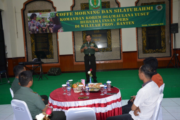 Demikian dikemukakan Danrem 064/MY, Kolonel Czi budi Hariswanto dalam acara Coffee Morning insan pers di Markas Korem 064/MY di Serang, Rabu (12/9/2018). “Selaku Danre dan pribadi, saya mengucapkan terimakasih atas prublikasi dari insan pers selama ini. Tanpa publikasi itu, kegiatan Korem 064/MY dan jajarannya tidak akan banyak diektahui masyarakat,” katanya.