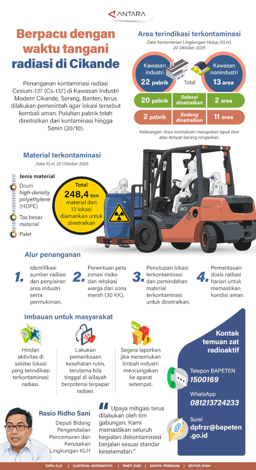 Penanganan kontaminasi radiasi Cesium 137 di Kawasan Industri Moden Cikande, Kabupaten Serang, Provinsi Banten terus dilakukan pemerintah agar lokasi tersebut kembali aman. Hingga Senin (20/10/2025), puluhan pabrik telah dinetralkan dari kontaminasi tersebut.