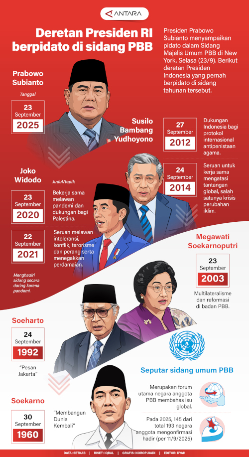 Presiden RI, Prabowo Subianto menyampaikan pidato dalam sidang Majelis Umum Perserikatan Bangsa-Bangsa (PBB) di Newyork, Amerika Serikat. Selasa (23/9/2025). Berikut infografis deretan Presiden Republik Indonesia yang pernah berpidato di Majelis Umum PBB tersebut.