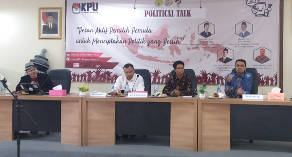Komisioner KPU Provinsi Banten, Masudi menghimbau, para pemilih pemula untuk menolak politik uang, karena disogok itu nikmatnya sebentar, sakitnya 5 tahun. Demikian dikatakan Masudi saat menjadi pemateri di acara Political Talking dengan tema “peran aktif pemilih pemula untuk menciptakan politik yang bersih” di Aula Kantor KPU Banten, Jumat (2/11/2018).