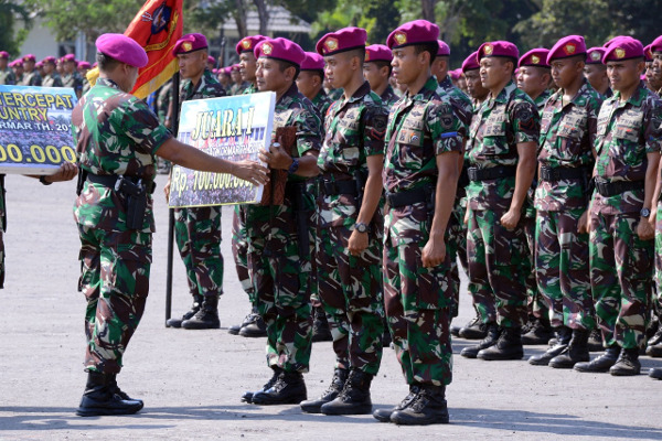 Komandan Pasmar 2 Brigjen TNI (Mar) Endi Supardi memberikan penghargaan (reward) kepada atlet Pembinaan Satuan (Binsat) Pasmar 2 yang berprestasi pada Lomba Binsat Marinir 2018 yang dikemas dalam apel khusus di lapangan apel Bhumi Marinir Karangpilang, Surabaya, Rabu (24/10/2018).