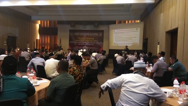 Dalam rangka menciptakan Pemilu serentak 2019 yang aman, damai dan sejuk, Kepolisian Resor (Polres) Serang dan Komando Distrik Militer (Kodim) 0602 Serang menggelar forum silaturahmi kamtibmas, Selasa (2/4/2019). Acara silaturahmi kamtibmas yang digelar di Hotel Horison Ultima Ratu, Kota Serang, diikuti ratusan tokoh agama, masyarakat dan tokoh adat serta para Kapolsek dan Danramil.