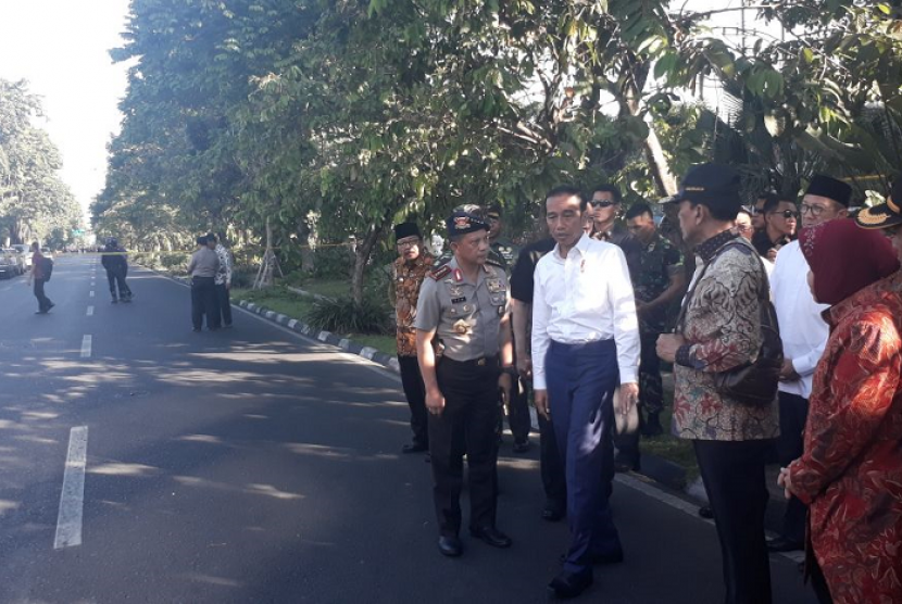 Presiden Joko Widodo meninjau langsung lokasi pengeboman yakni Gereja Kristen Indonesia yang berada di jalan Diponegoro. Ia mengenakan kemaja panjang putih dan tiba di lokasi sekitar pukul 15.33 WIB, Minggu (13/5/2018).