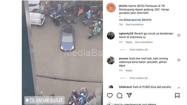 Video viral memperlihatkan mobil Tesla terendam banjir di Jakarta tepatnya di bilangan TB Simatupang depan gedung JGC.